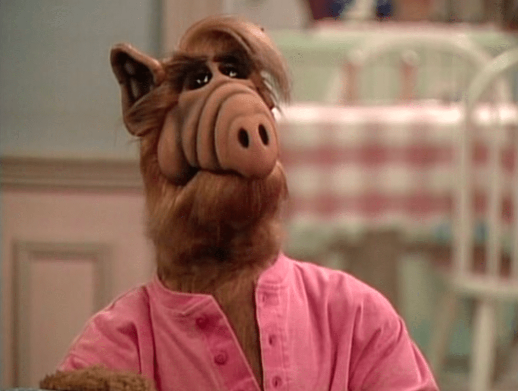ALF wears a pink henley shirt