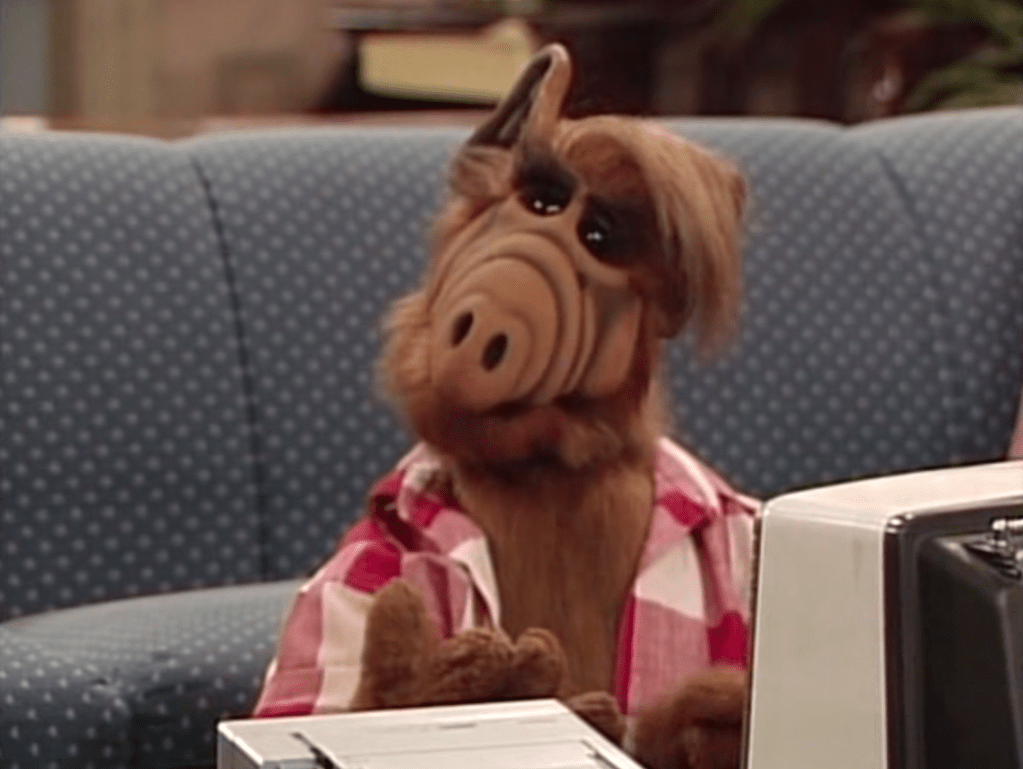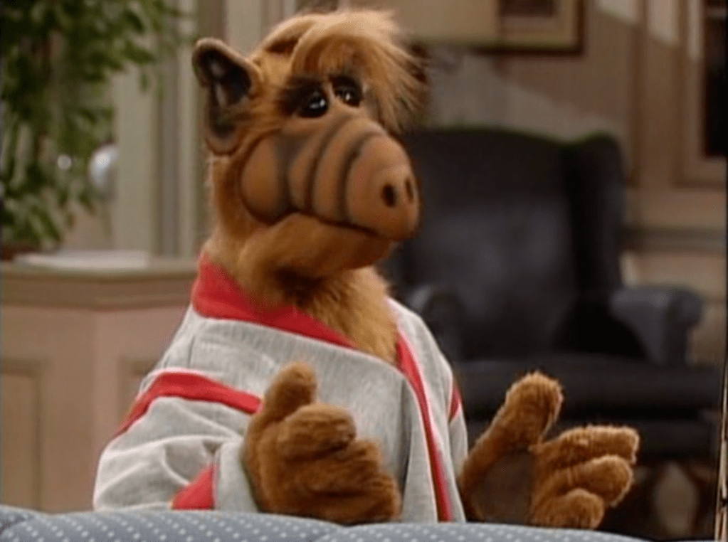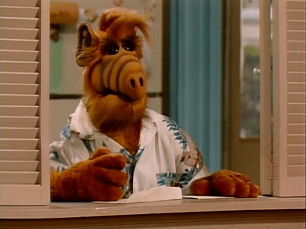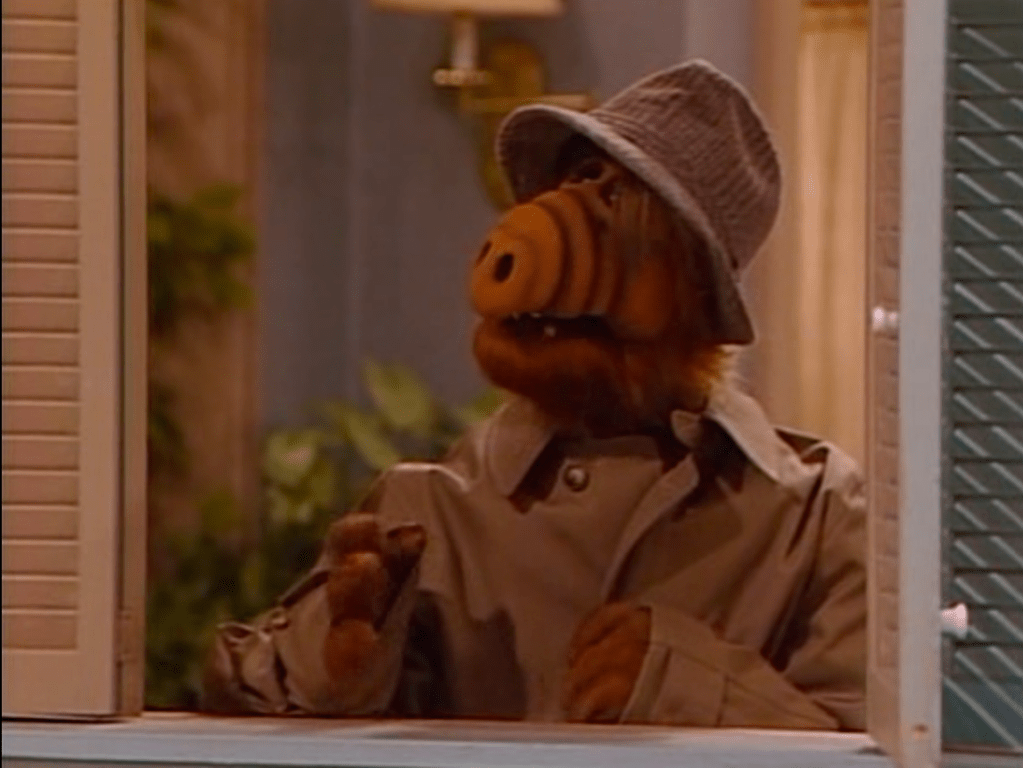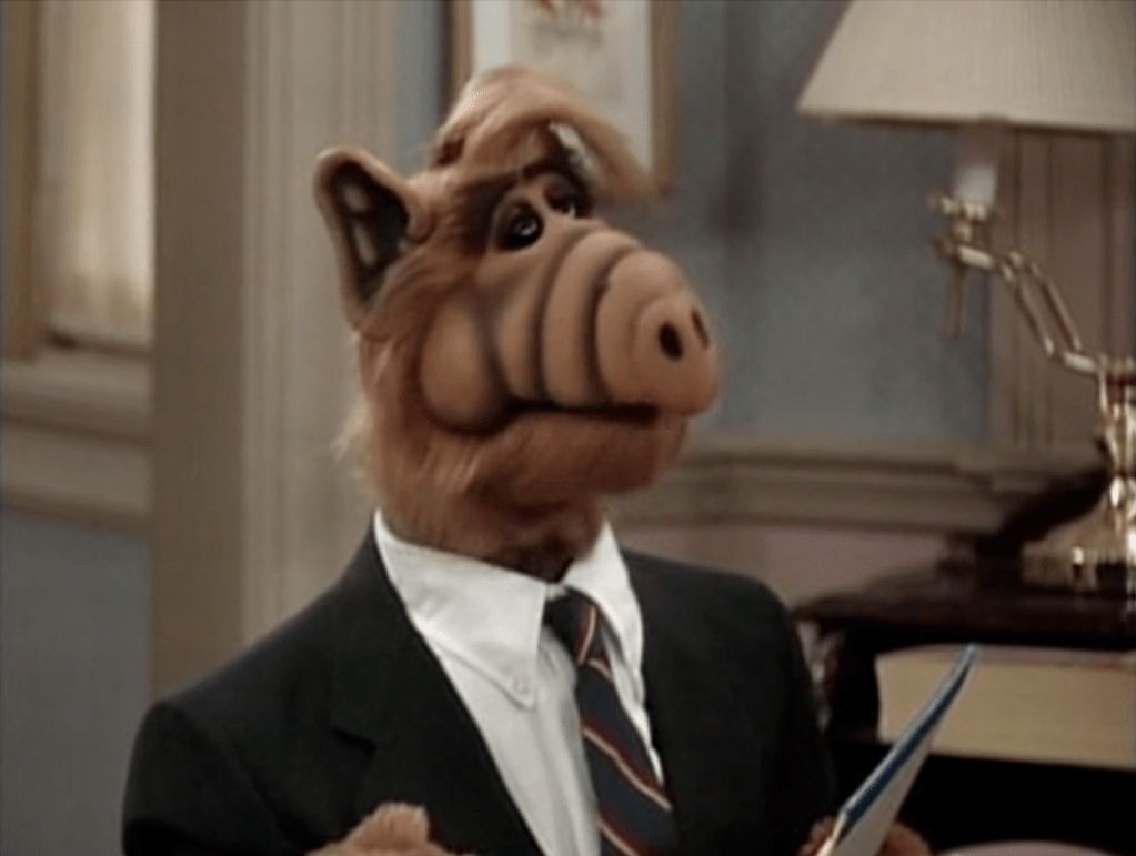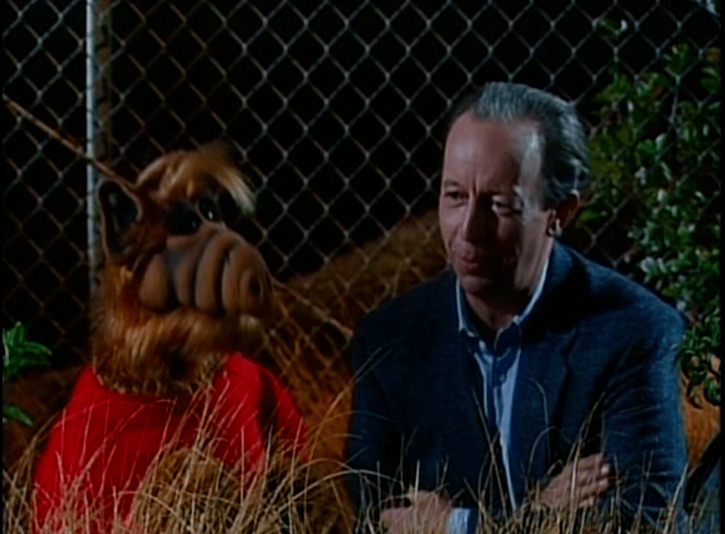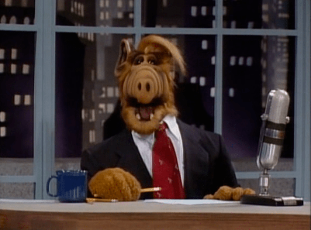 In one of ALF’s fantasies of revealing himself to the world, he serves as a substitute host for David Letterman in a suit.
