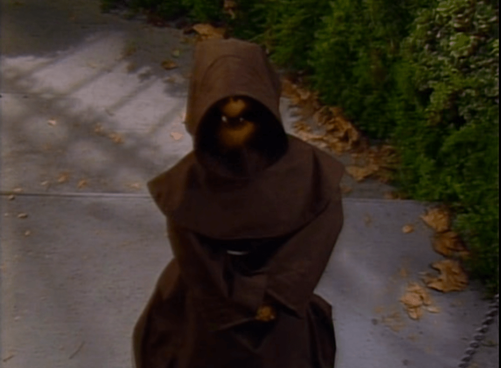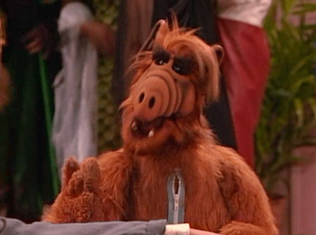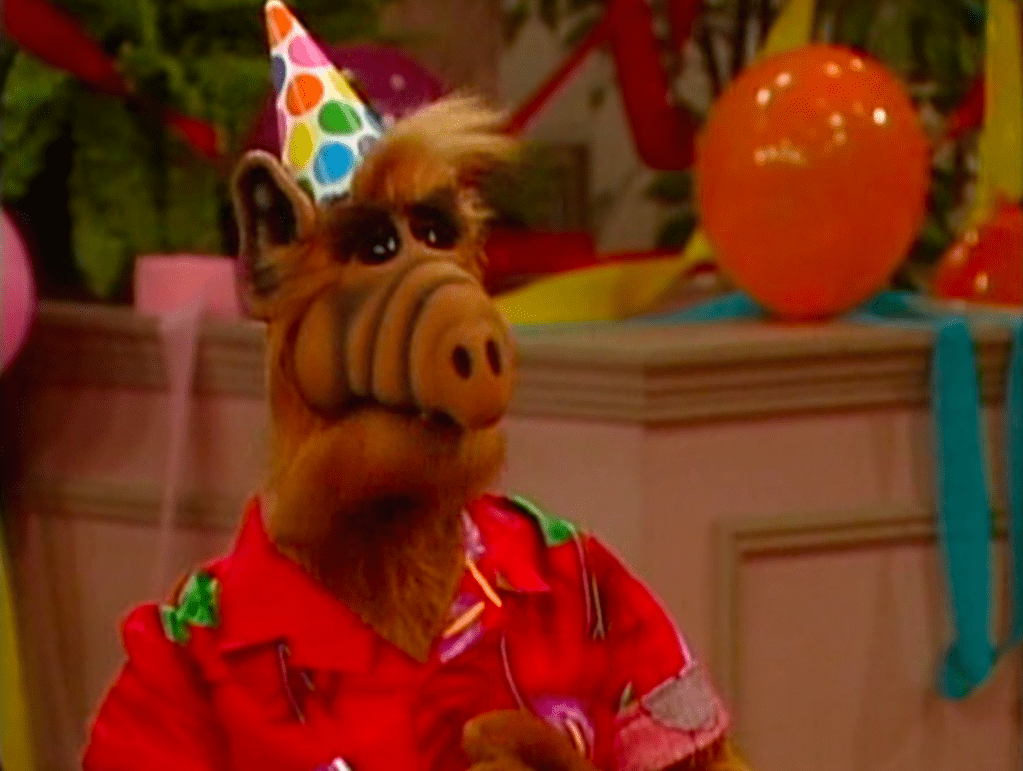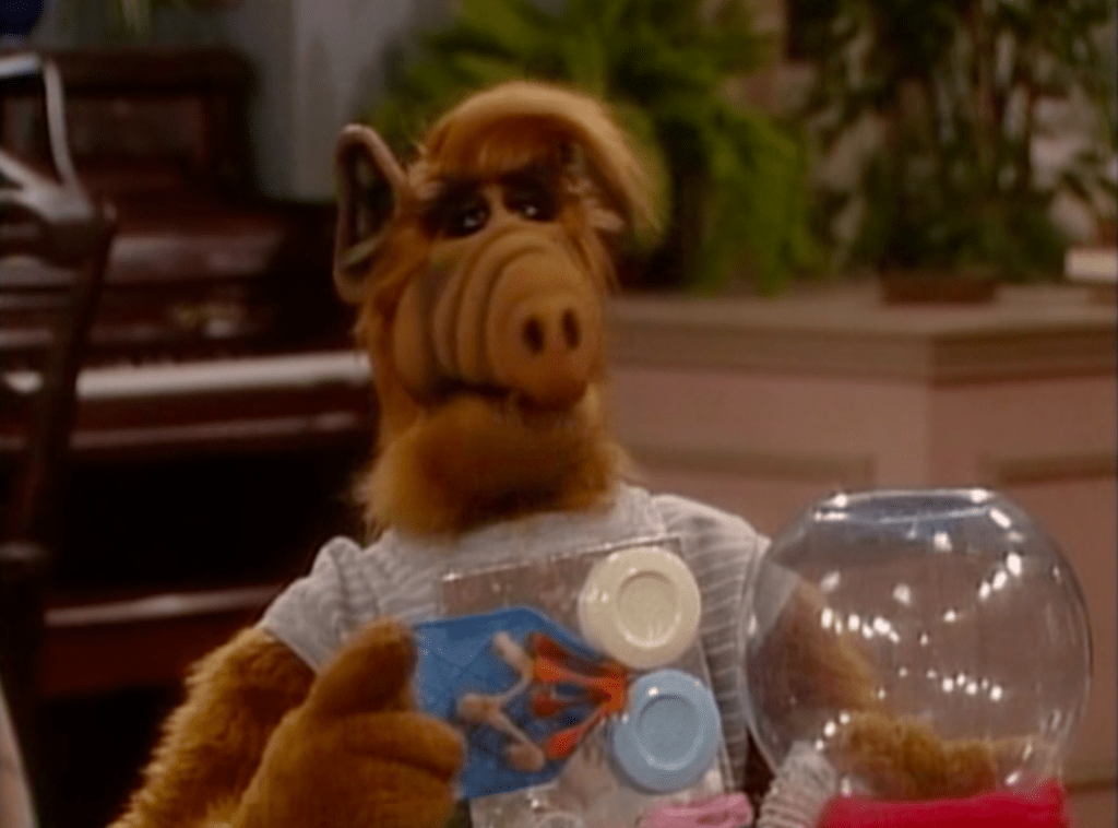 ALF makes an appearance at the Tanner’s Halloween party as himself, but with a giant zipper in the front.