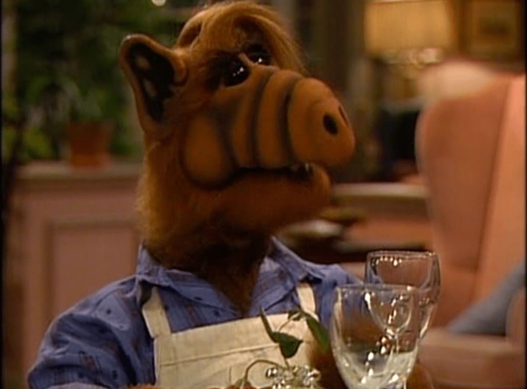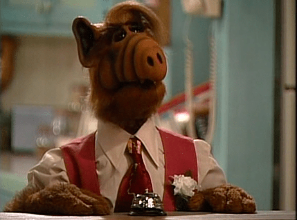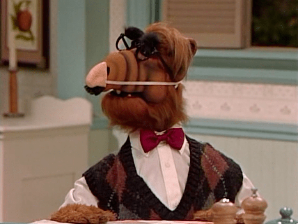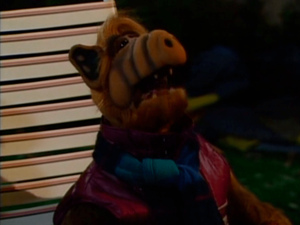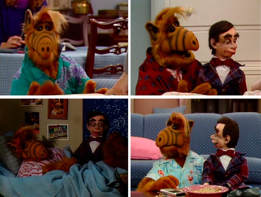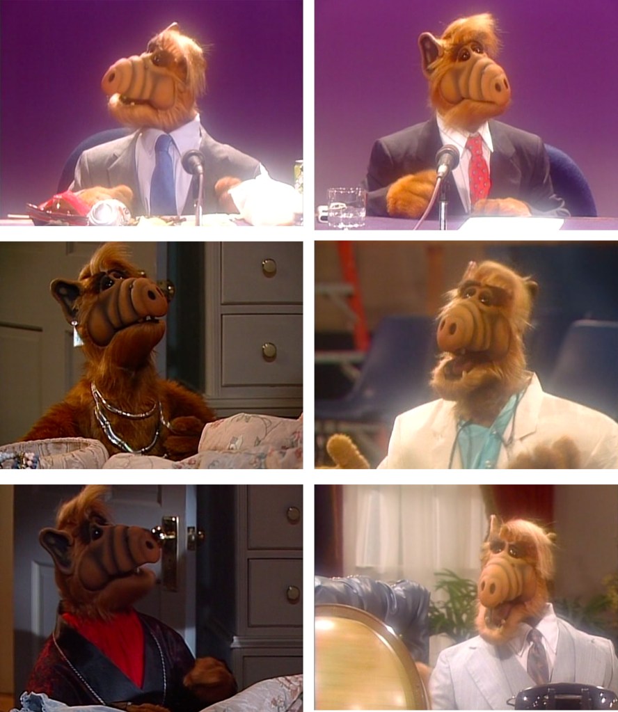 An episode filled with six different outfits! ALF keeps appearing in Kate’s dream in different suits in a debate. Then out of the dream, ALF goes from wearing Kate’s jewelry to a red smoking jacket.