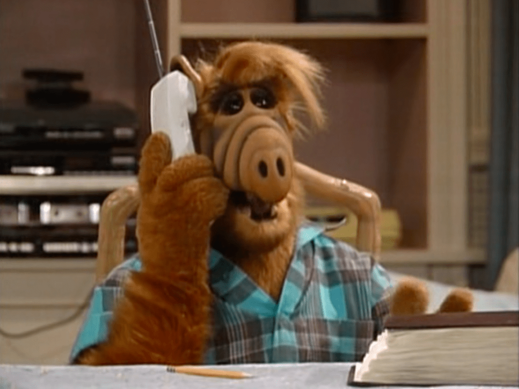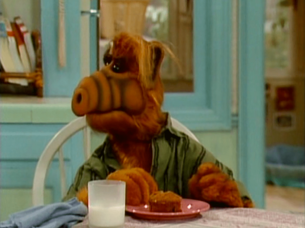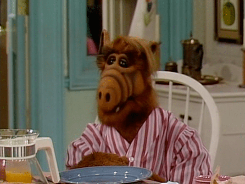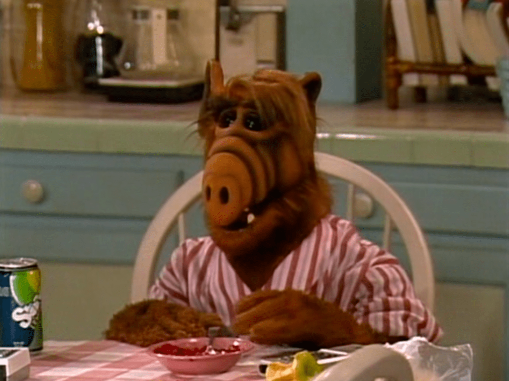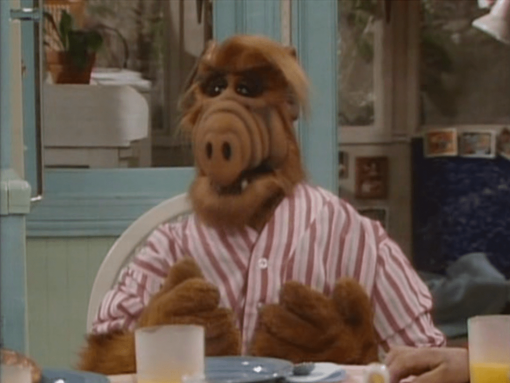 ALF’s back with his red and white striped pajamas. The second appearance of these pajamas.