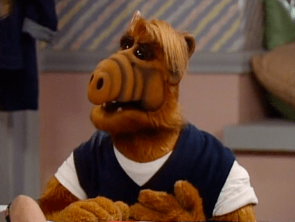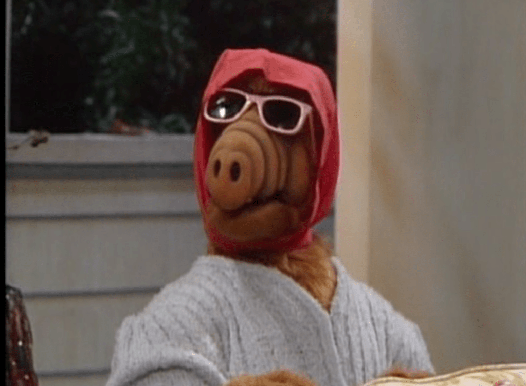 ALF’s disguise of a pink scarf and glasses, with a light blue sweater.