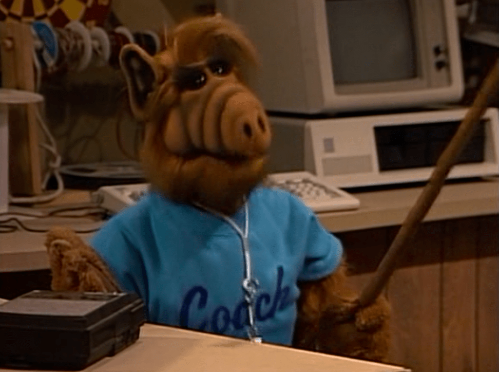 To help Lynn with a pageant, ALF dawns his blue “coach” sweatshirt