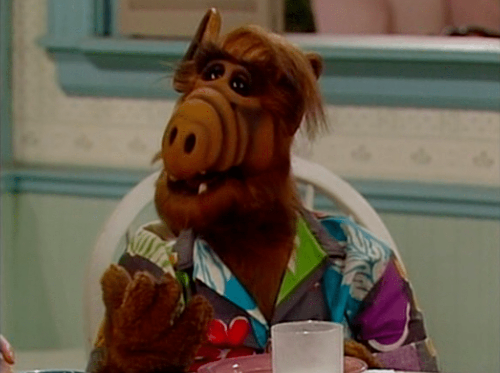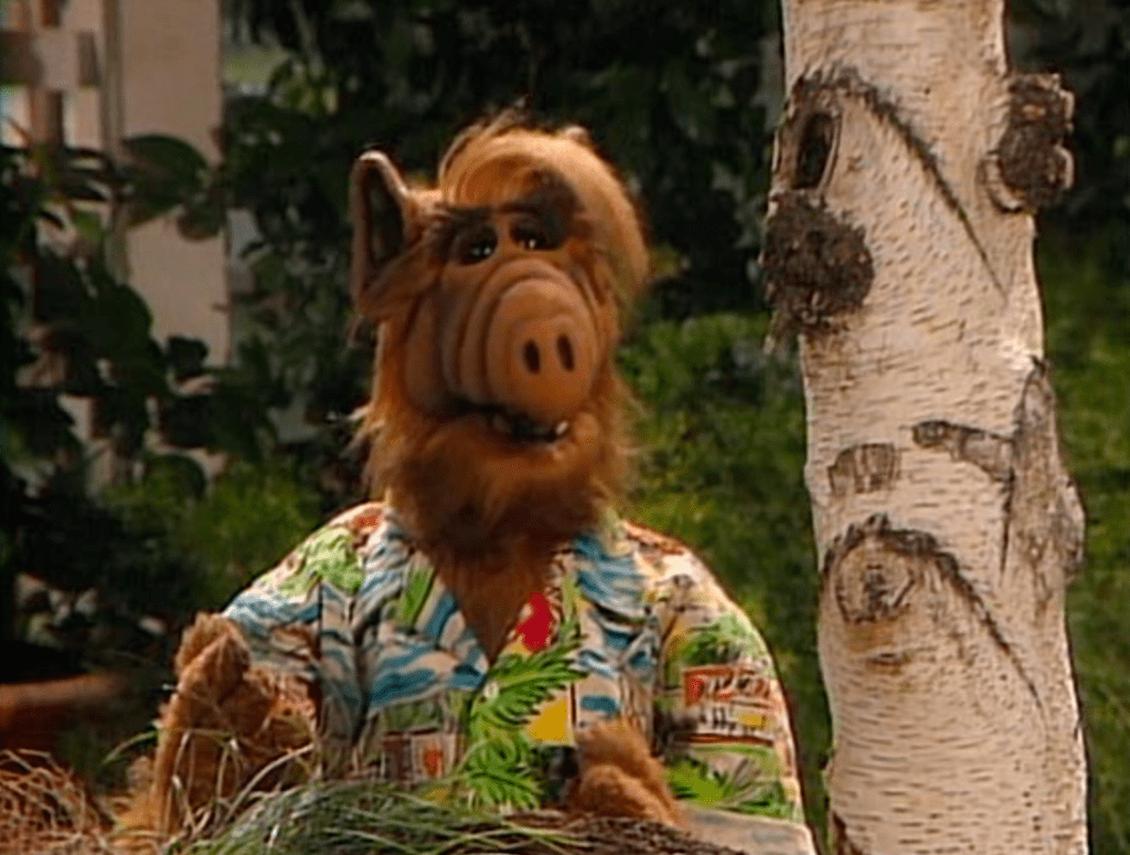 ALF wears a multicolor Hawaiian shirt