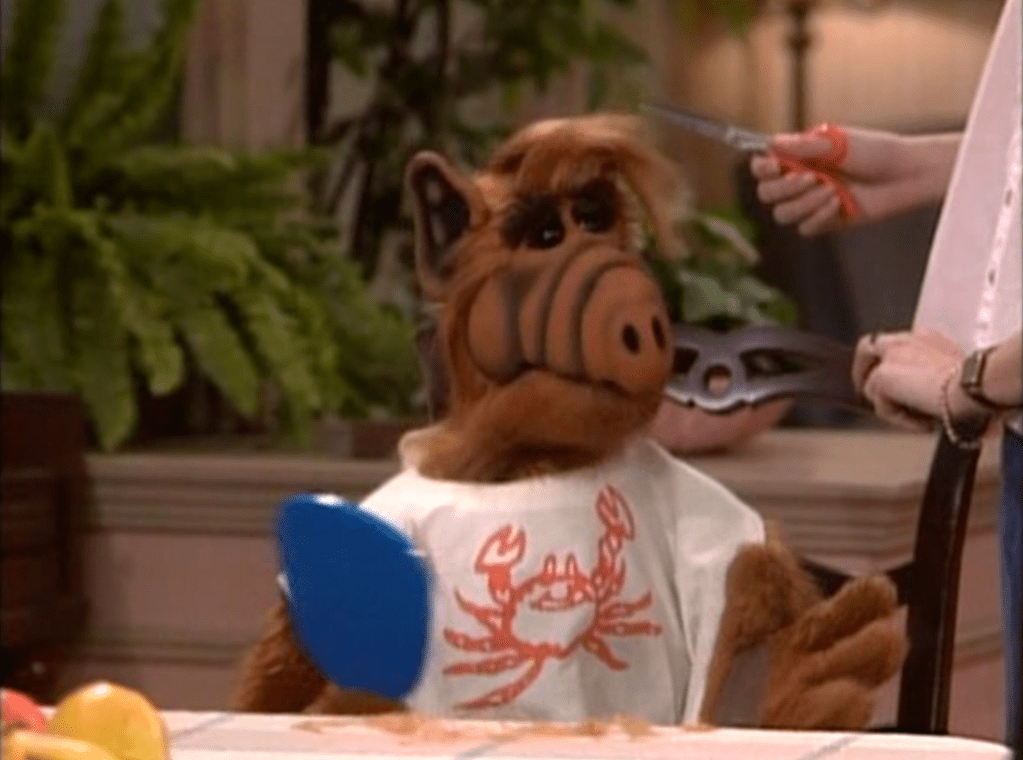 While getting a haircut, ALF wears a crab bib