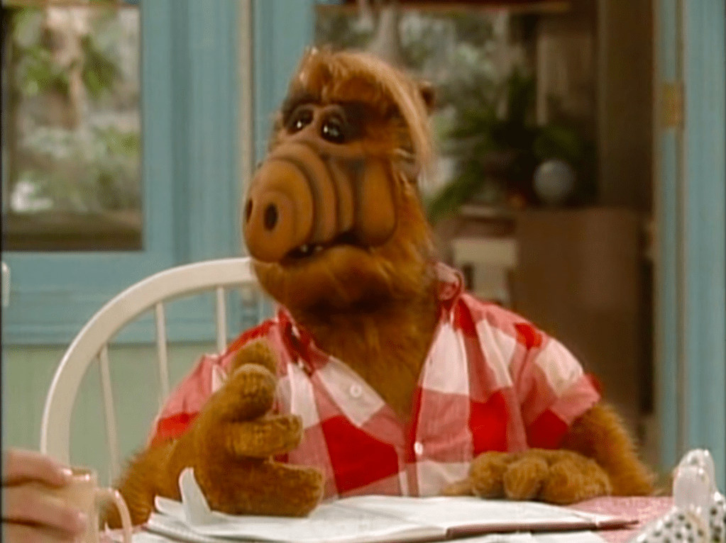 ALF wears a red and white checkered button down